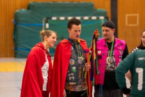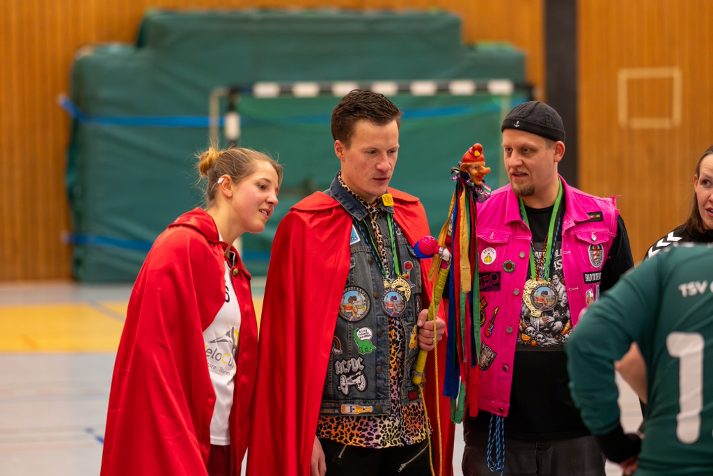 Unter besonderen Vorzeichen ging die MSG Neuhof/Eichenzell am vergangenen Samstag in ihr Heimspiel gegen den VfL Wanfried III. Nachdem die Gäste eine Woche zuvor aufgrund von Spielermangel ihr Spiel absagen mussten, erklärten sie sich sportmännisch bereit, das Heimspielrecht zu tauschen. So konnte die Partie kurzfristig in Neuhof ausgetragen werden – ein Umstand, den die MSG dankend annahm. Für einen zusätzlichen emotionalen Rahmen sorgte das amtierende Lumpen-Prinzenpaar Antonia und Kilian Kulla. Lumpazi Antonia eröffnete feierlich die Partie mit dem Anwurf nach alter TV-Neuhof-Fastnachtstradition.